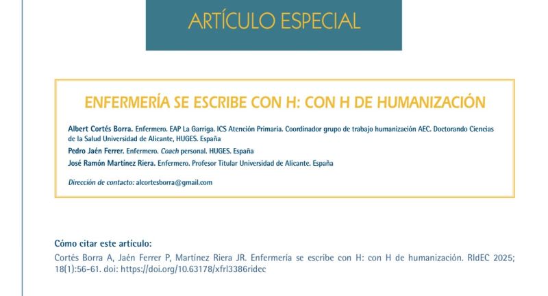 Publicado en RIdEC: Cortés Borra A, Jaén Ferrer P, Martínez Riera JR. Enfermería se escribe con H: con H de humanización. RIdEC 2025; 18(1):56-61. doi: https://doi.org/10.63178/xfrl3386ridec